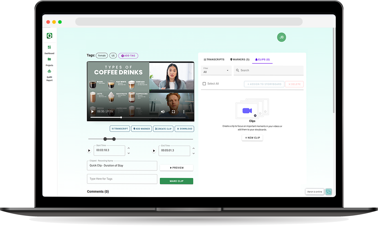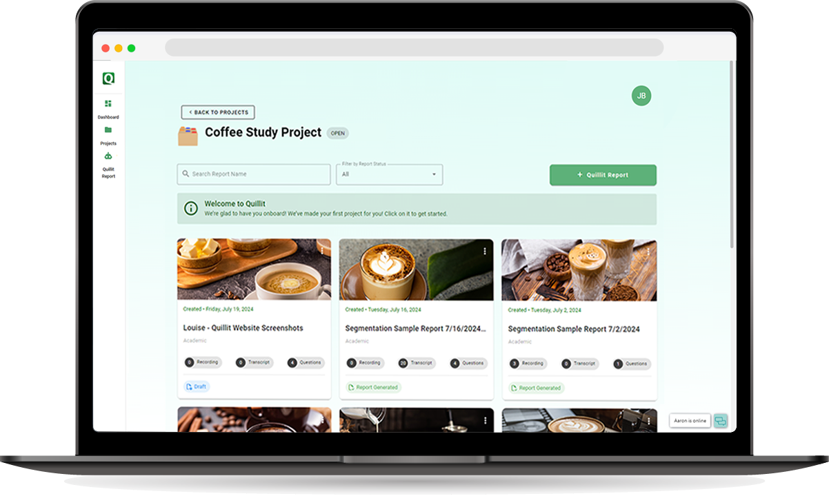 Store and access all recordings and transcripts in Quillit®, a secure AI-powered research assistant, sorted by project.