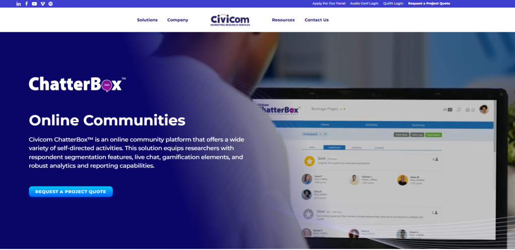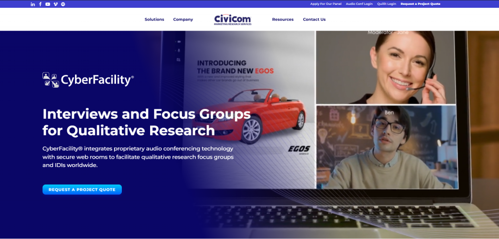 Civicom® Marketing Research Services provides web-enabled qualitative research tools for market research. Our full-service solutions include online IDI and focus group facilitation, mobile research, online communities, respondent recruitment, and an AI-powered research assistant, Quillit, for analysis and report writing. Contact us to see how we can help you achieve project success. Our Motto:“Your Project Success Is Our Number One Priority”.