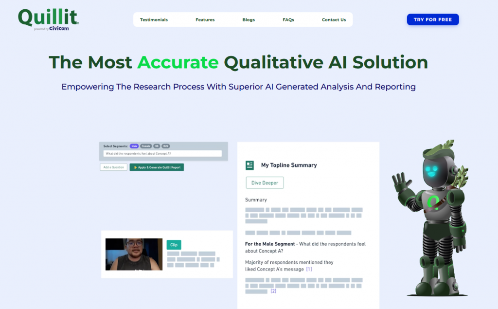 Civicom® Marketing Research Services is a global leader at the forefront of optimizing technology as it has evolved for Qualitative Research over the past 25 years. Experts in helping researchers embrace technology, their suite of services includes technology for in-depth interviews, focus groups, online communities, mobile research, and Quillit, Civicom’s AI-powered research assistant for qualitative analysis and report writing. Civicom is known for its dedication to service quality and for the company’s motto “Your Project Success Is Our Number One Priority.”