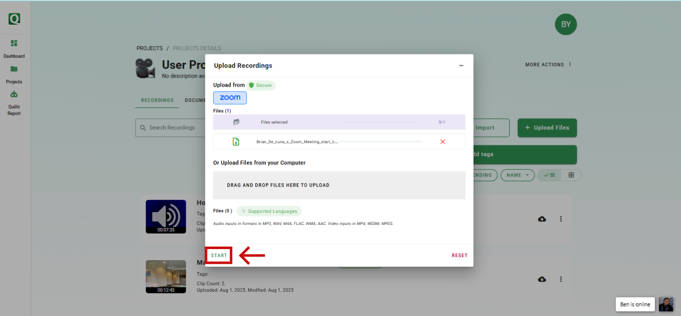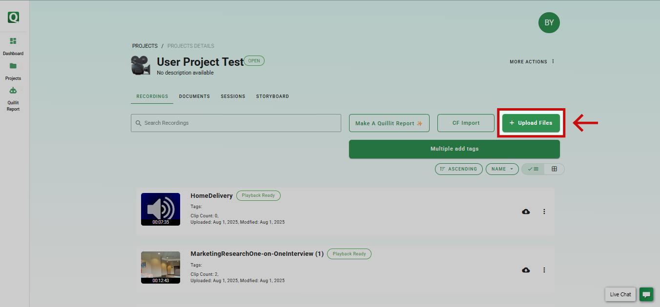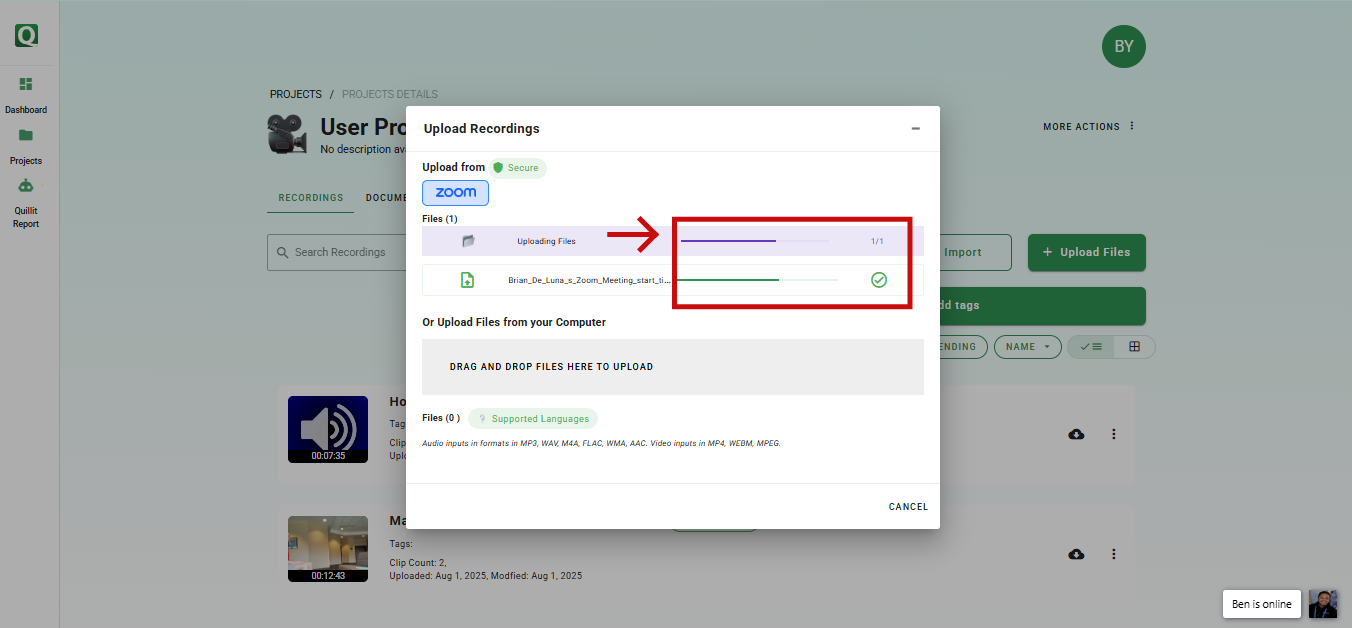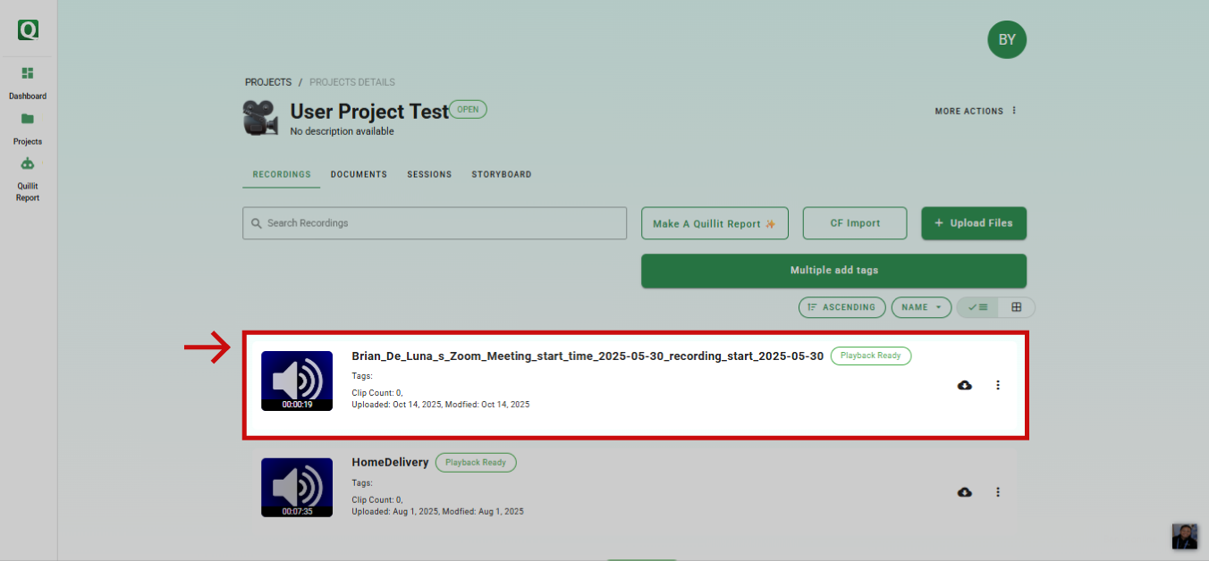 • Once the upload is complete, verify that your recordings appear in the project's file list
