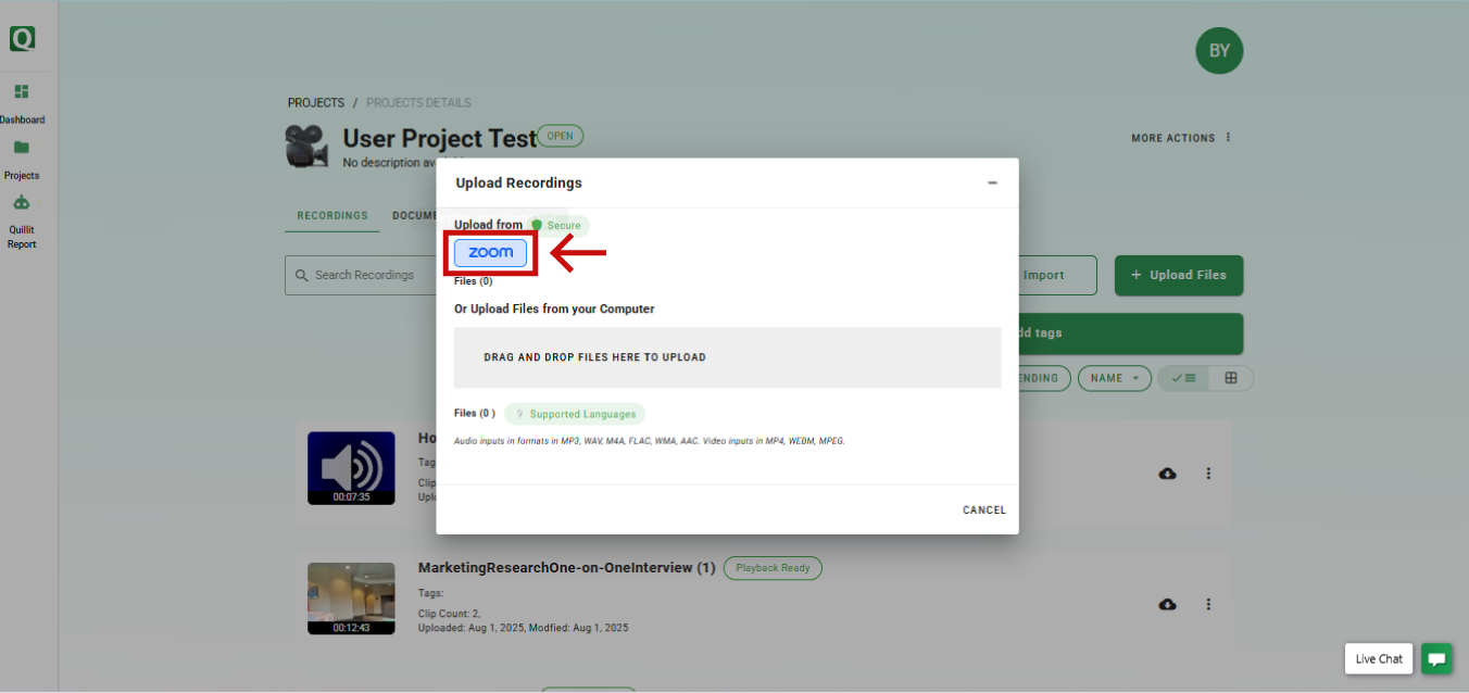 • Open a project and navigate to its Detail page. Then, click "Upload Files" and select "Zoom Cloud" as the source