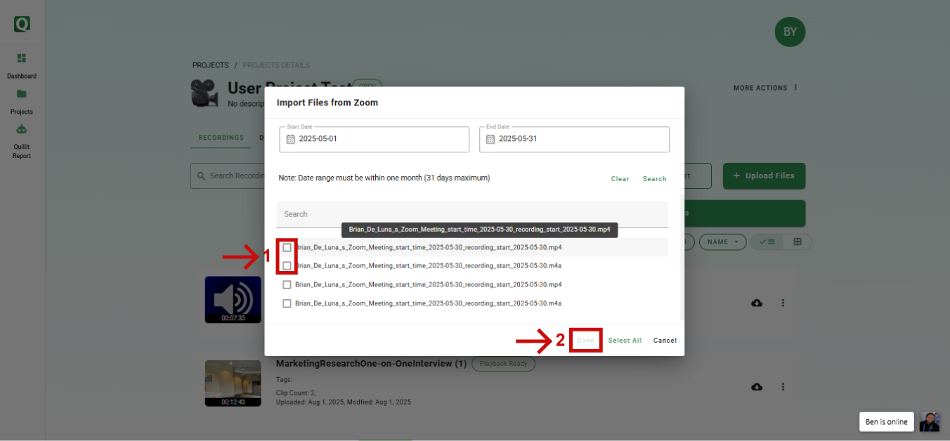 1. Select the Zoom files you want to upload from the list